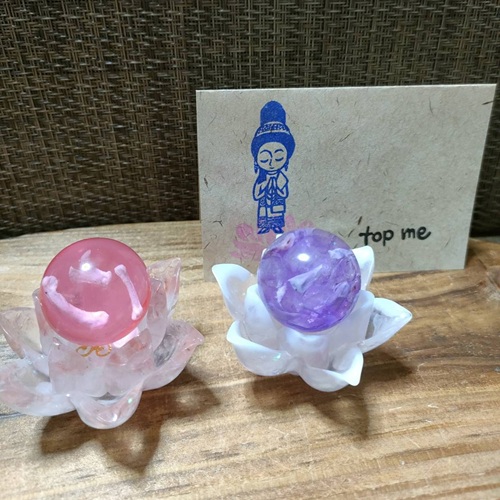 猫の遺骨が入った蓮の花と球体のメモリアル遺骨オルゴナイト